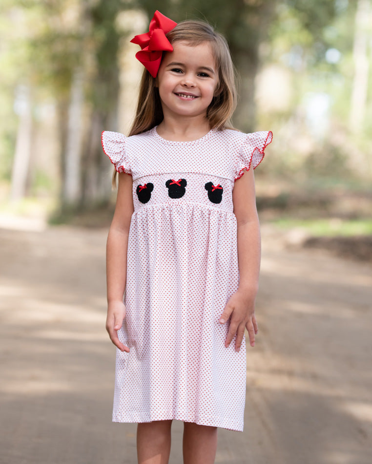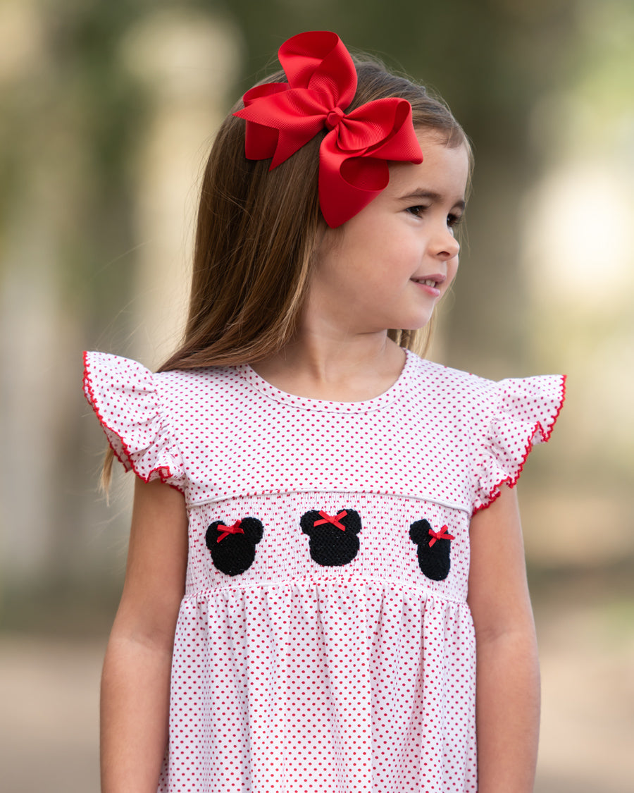 Mouse With Red Bow Smocked Polka Dot Knit Dress