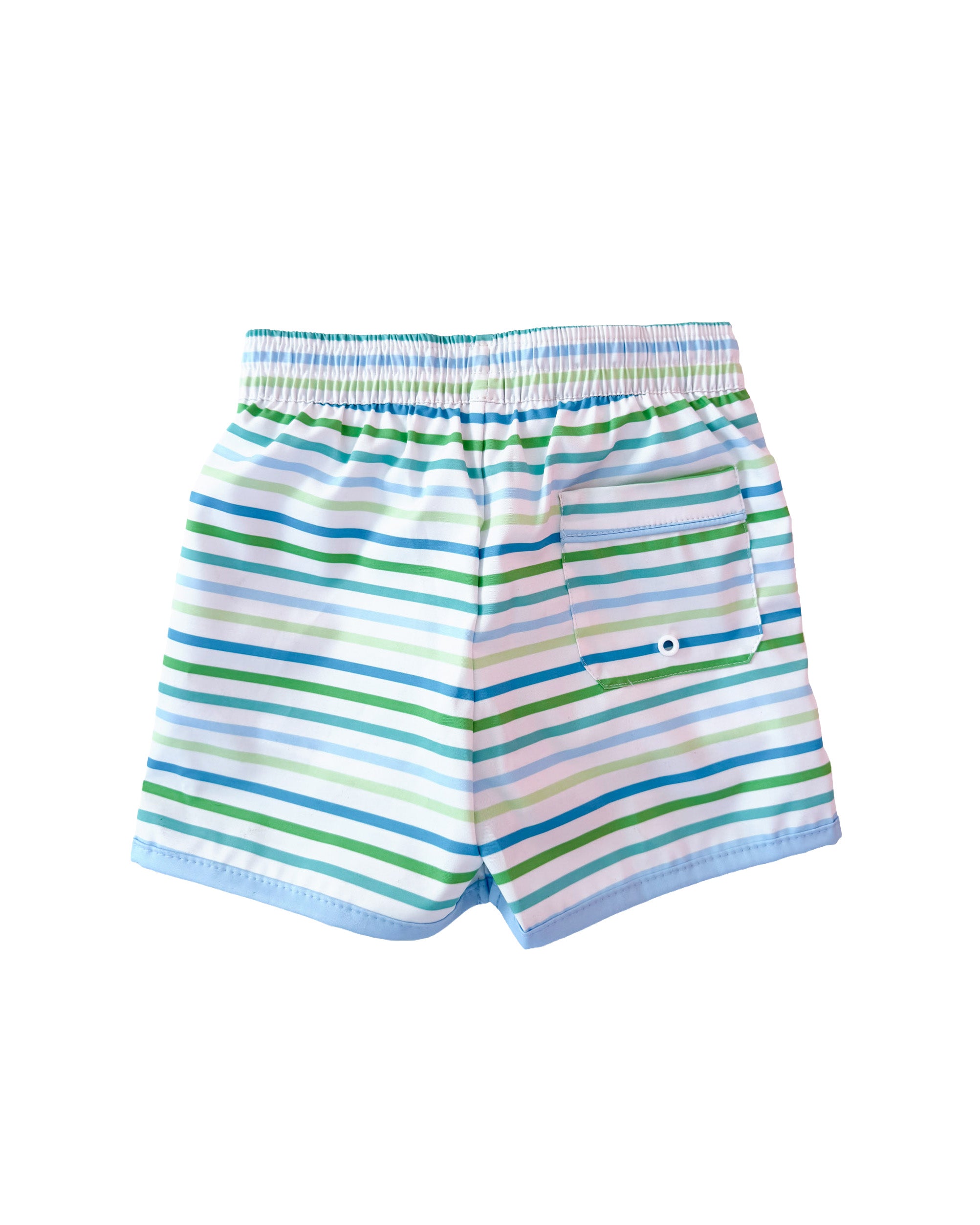 Your little one is sure to have fun in the sun in these Coastal Stripes Swim Trunks. Trunks feature an elastic waist band with tie with light bue trim. Ultra soft snug fit shorts lining inside make for a comfortable fit all day long. Add a personal touch with a monogram on the front left hem.
