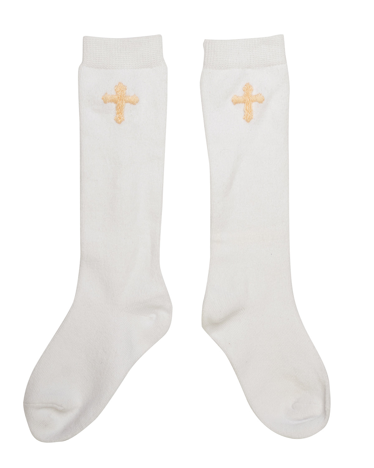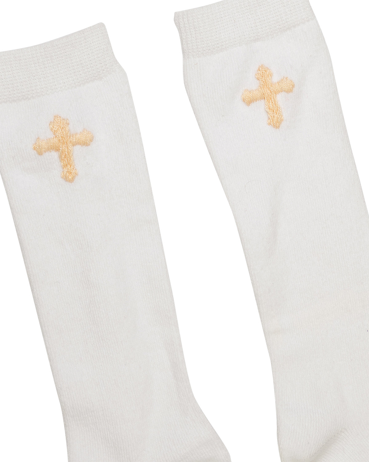 These knee high socks are perfect for Easter, Baptism, or a Christening. Socks feature a hand embroidered cream color cross at the top. 100% cotton.