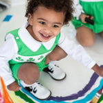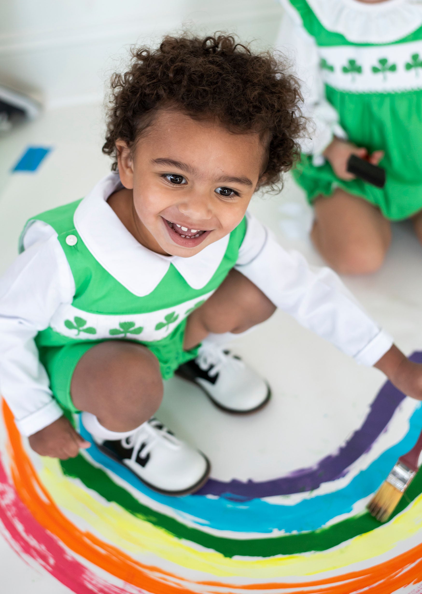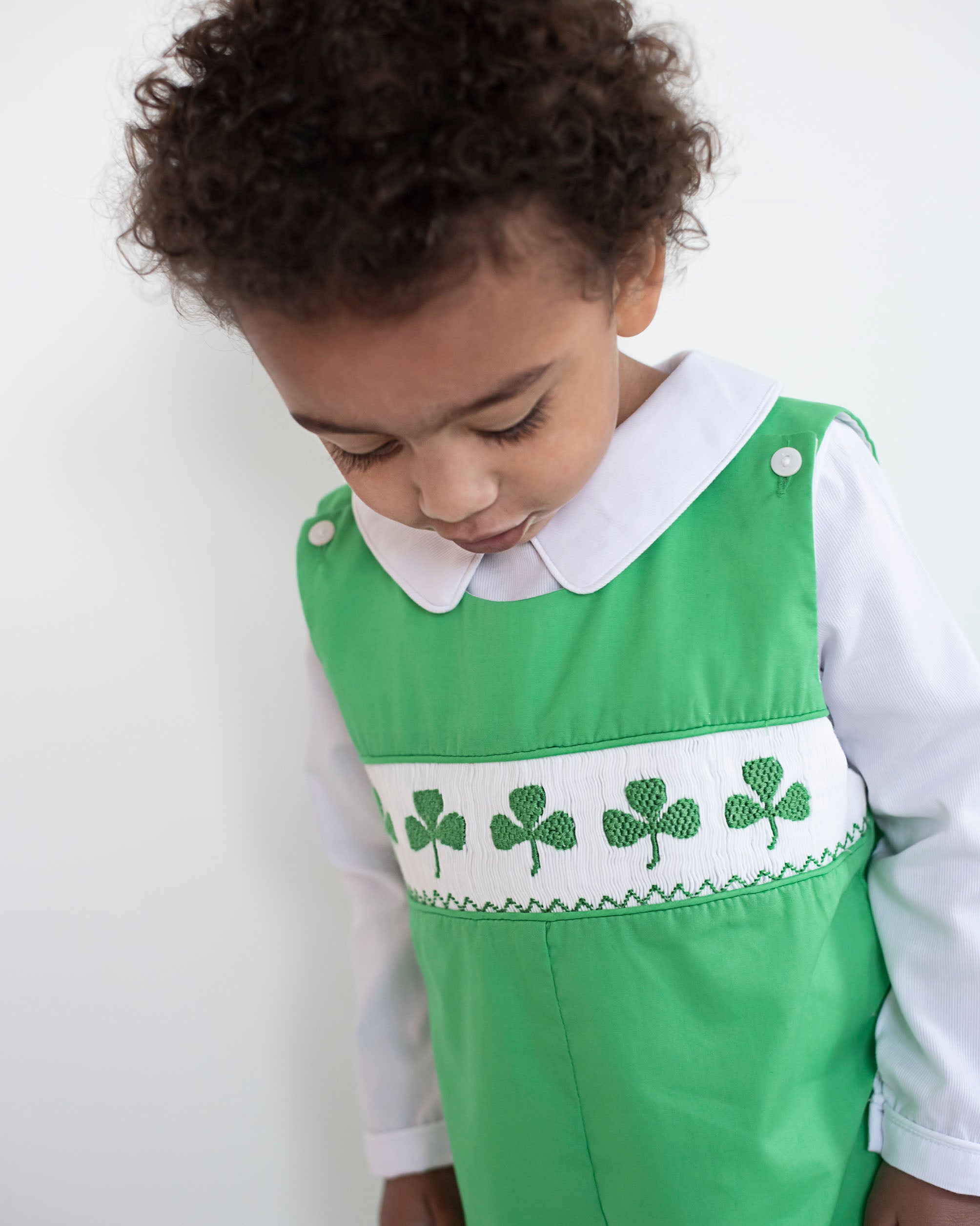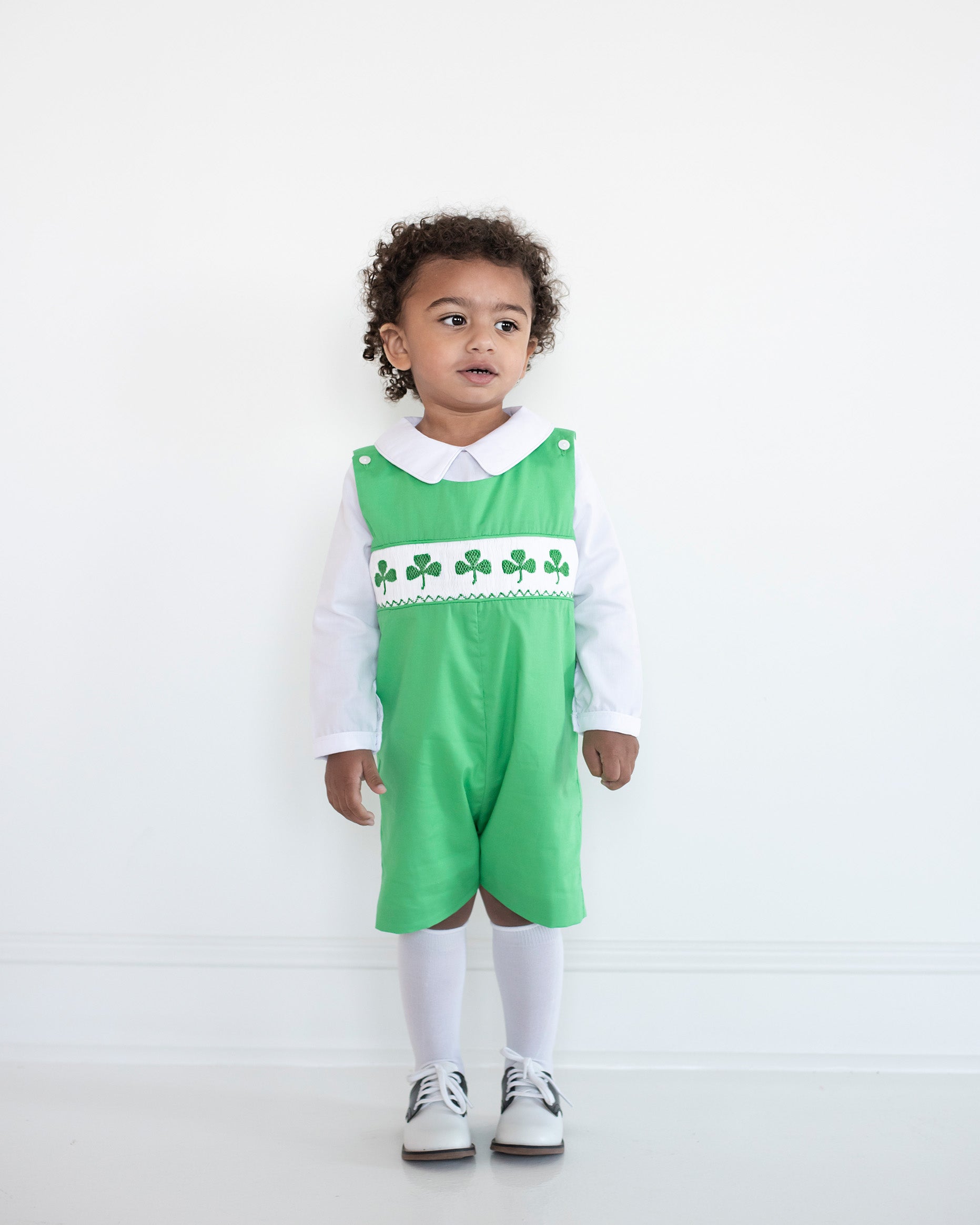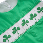 Perfect for St. Patrick’s Day playdates and springtime adventures, this green knit shortall features playful shamrock embroidery and a comfortable, breathable fit. The smocked design adds a touch of Irish elegance, making it an ideal choice for St. Patrick's Day celebrations or casual outings with family and friends.