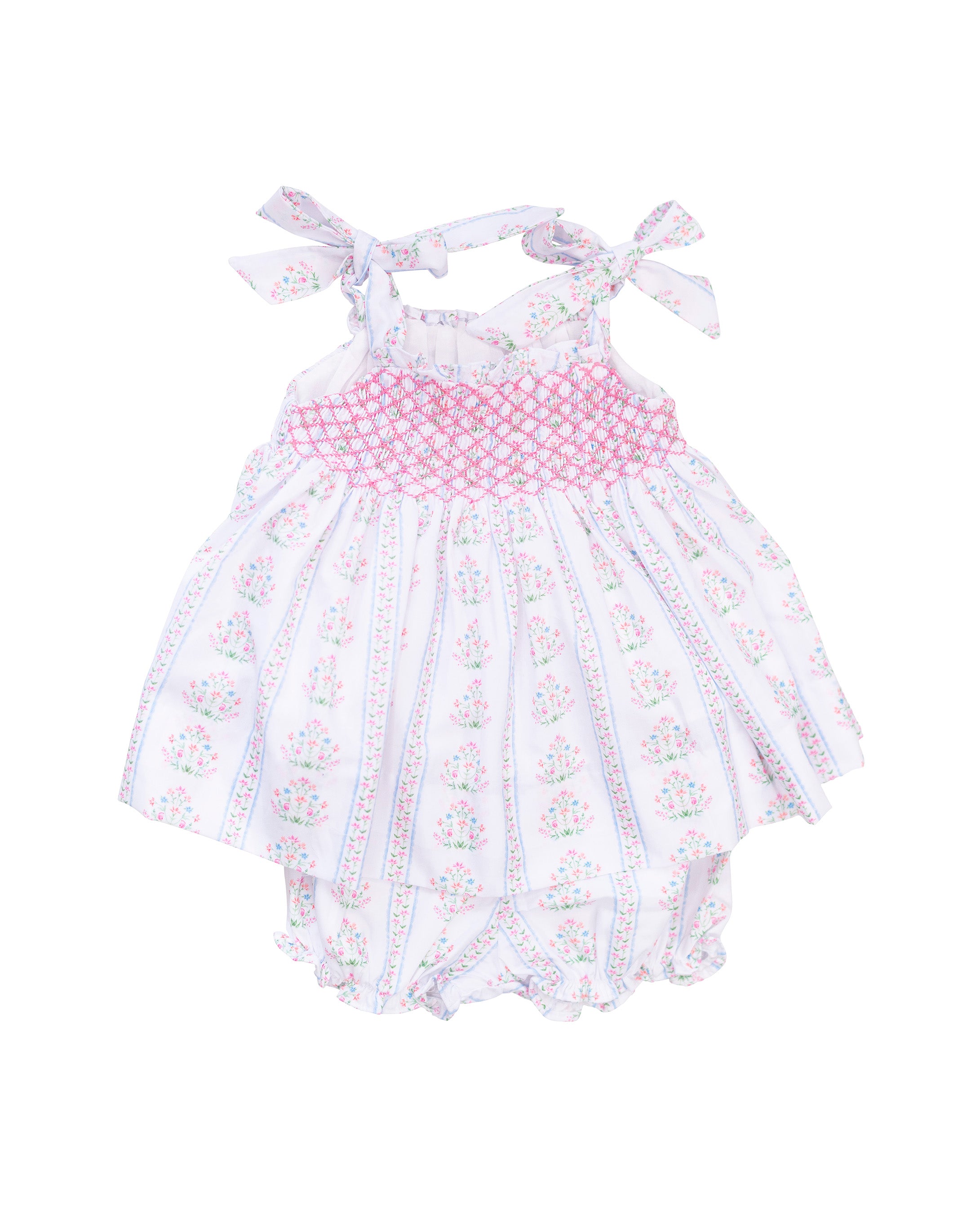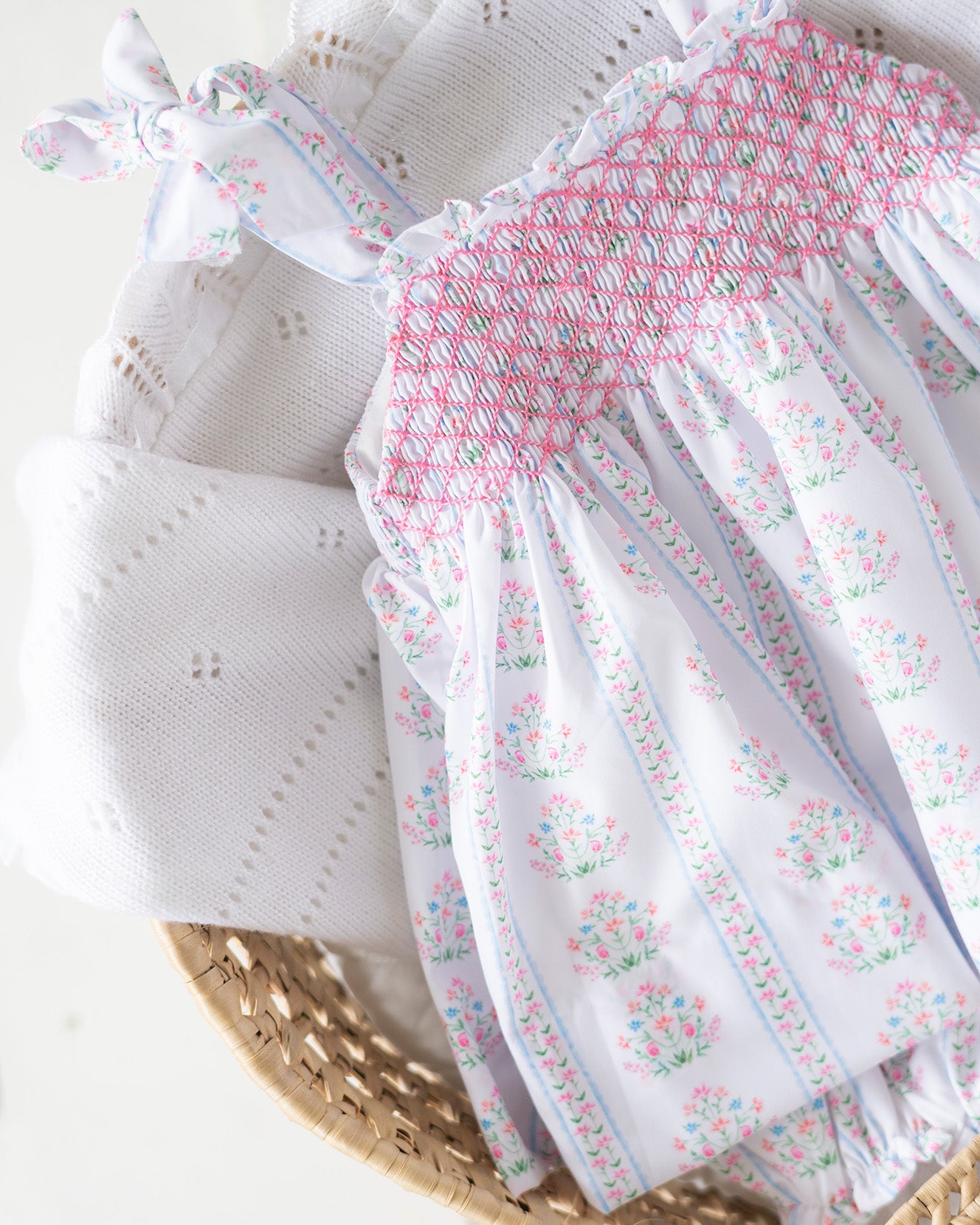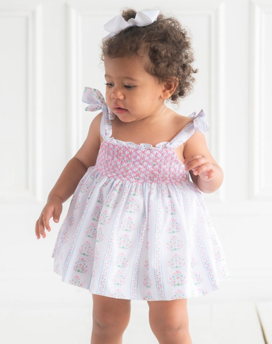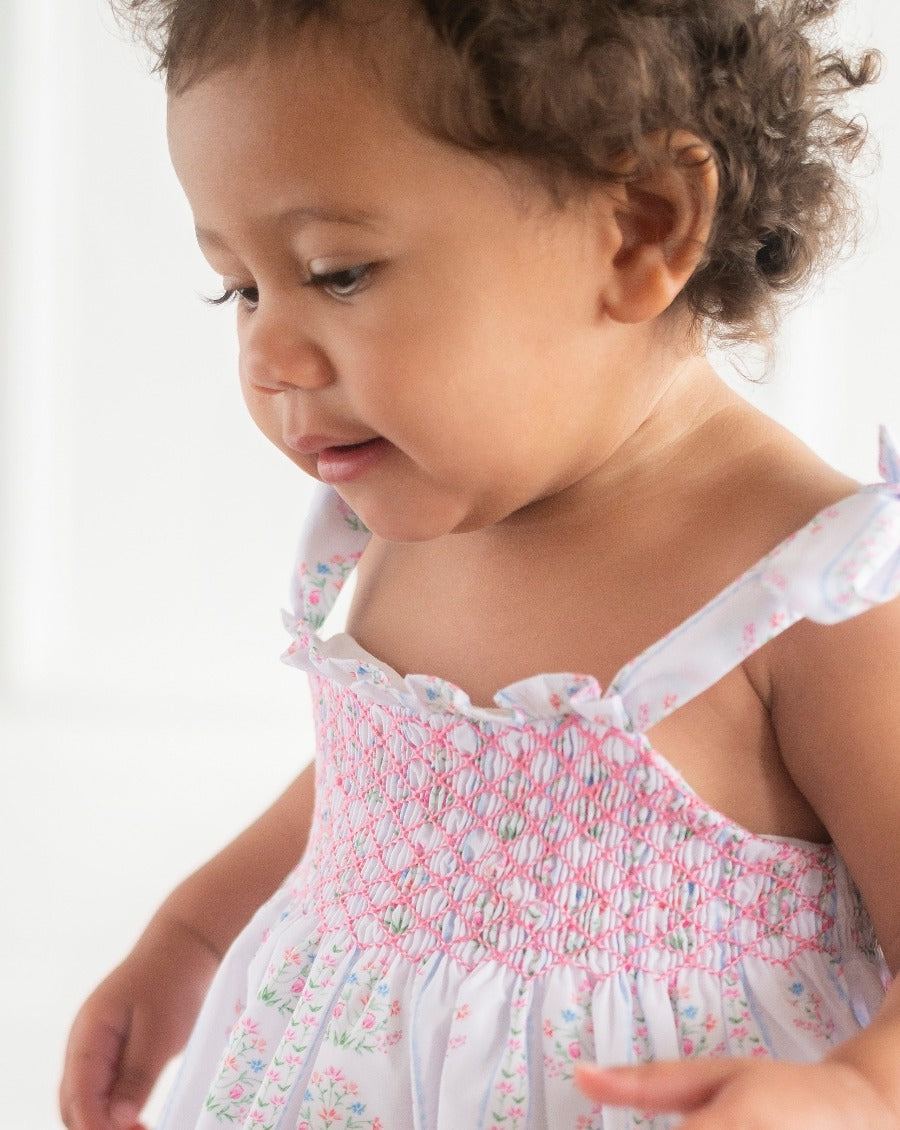 This Bright Floral Smocked Bloomer Set is sure to delight your little one this summer. Bloomer Set features a custom floral design, pink smocking, and adjustable tie straps. 100% cotton