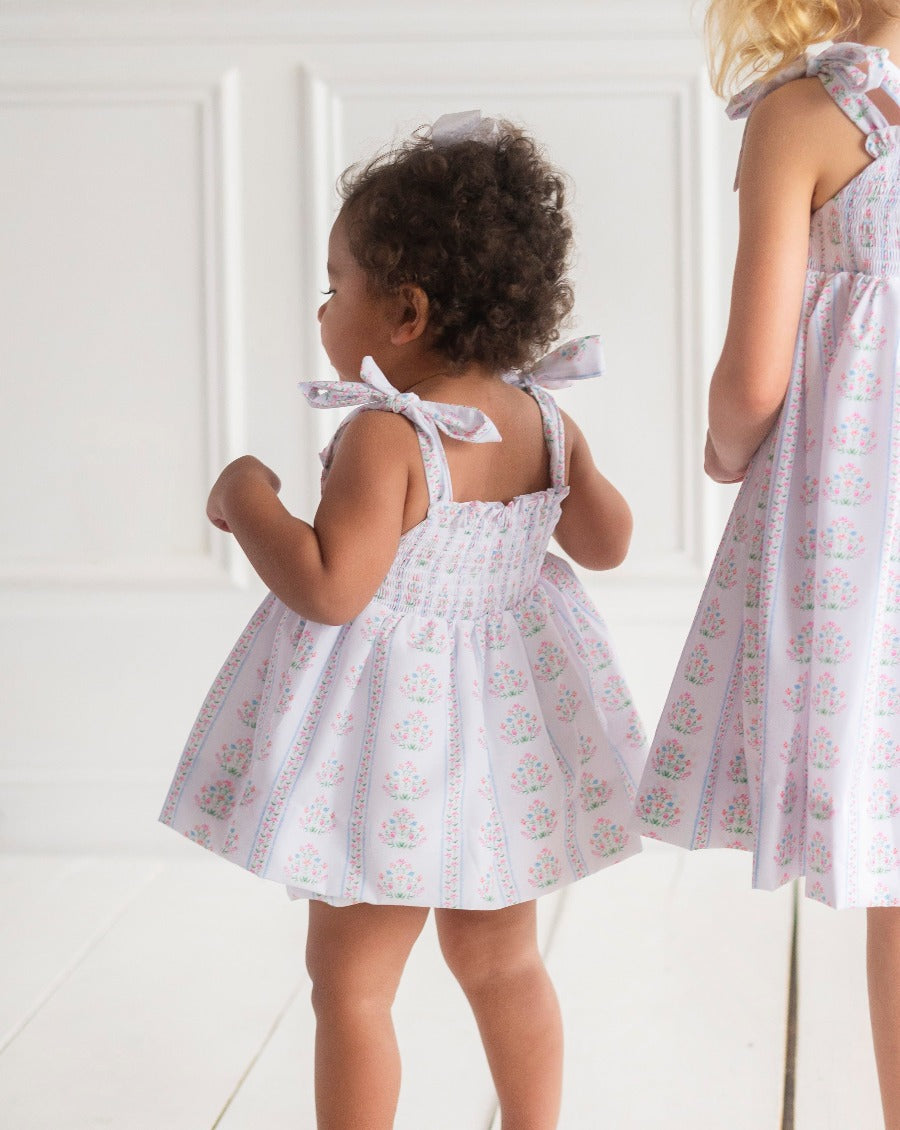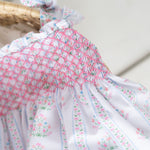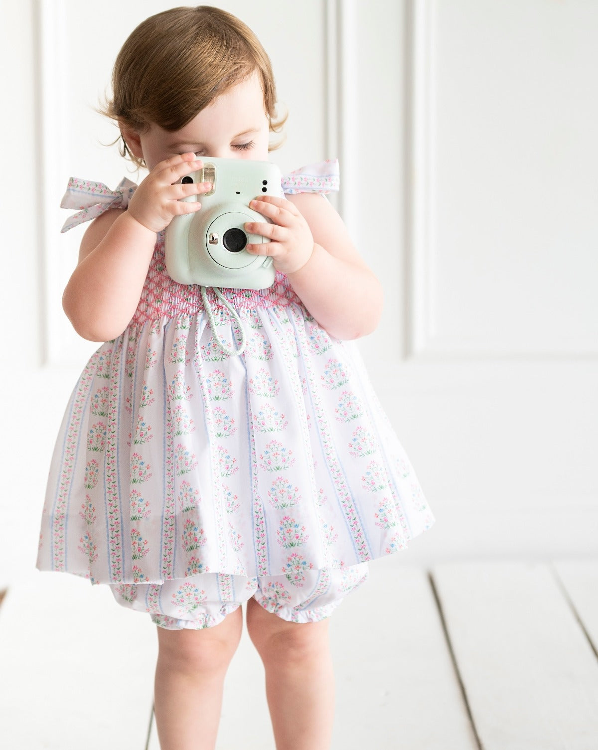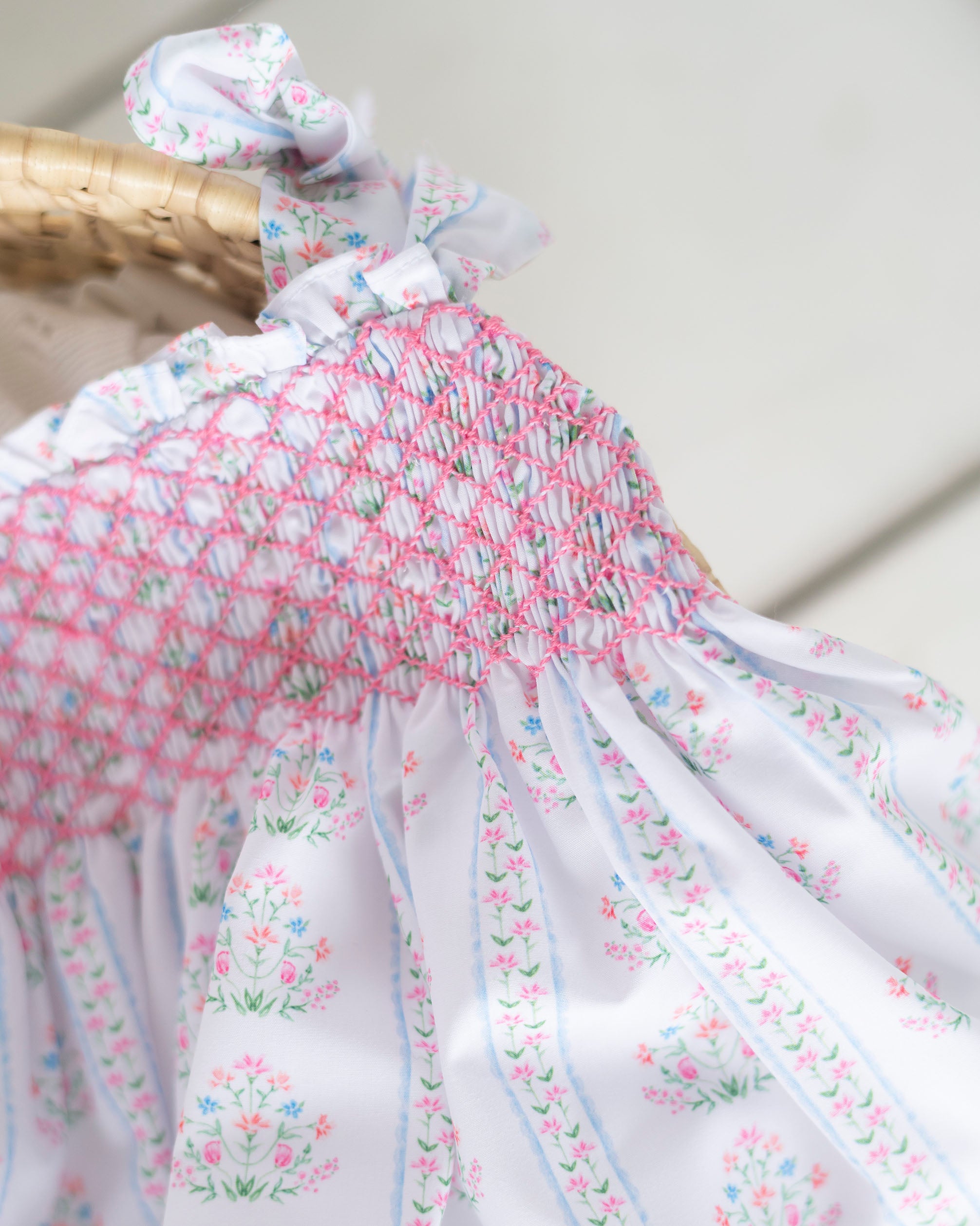 This Bright Floral Smocked Bloomer Set is sure to delight your little one this summer. Bloomer Set features a custom floral design, pink smocking, and adjustable tie straps. 100% cotton