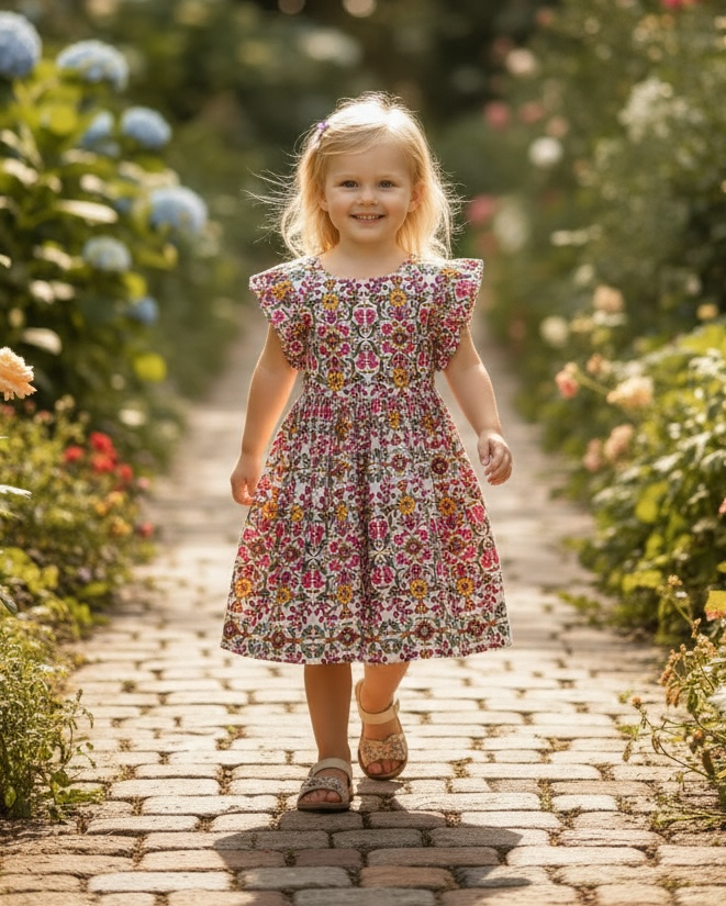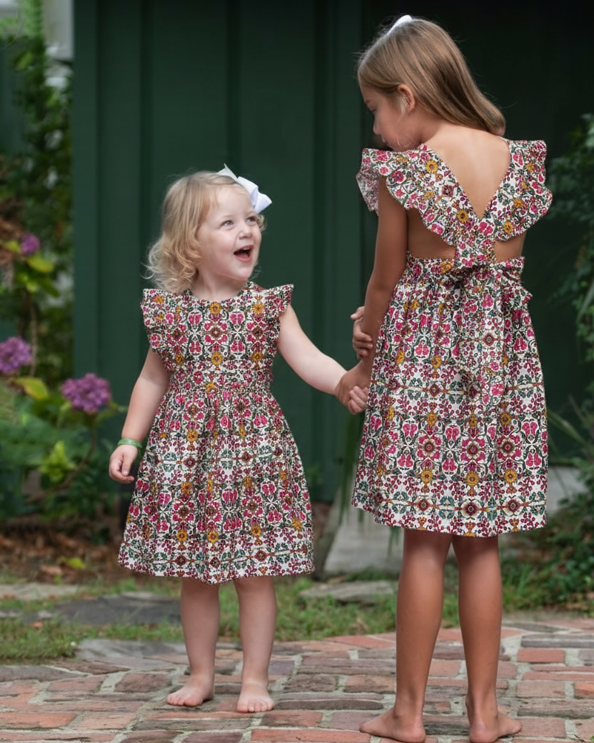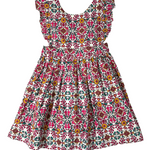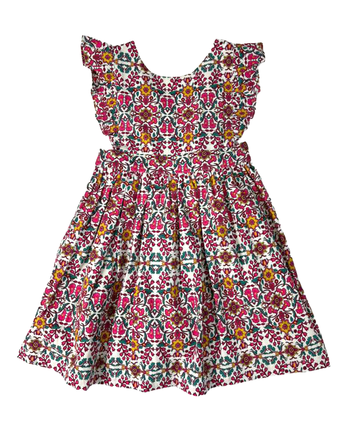 This vibrant penny dress features a playful tutti frutti floral block print full of cheerful color. The lively pattern brings a fresh and joyful feel to every wear. Perfect for warm days and special occasions. The dress features criss cross straps in the back with adjustable buttons and a tie in the back for the perfect fit. A delightful choice for brightening any wardrobe.