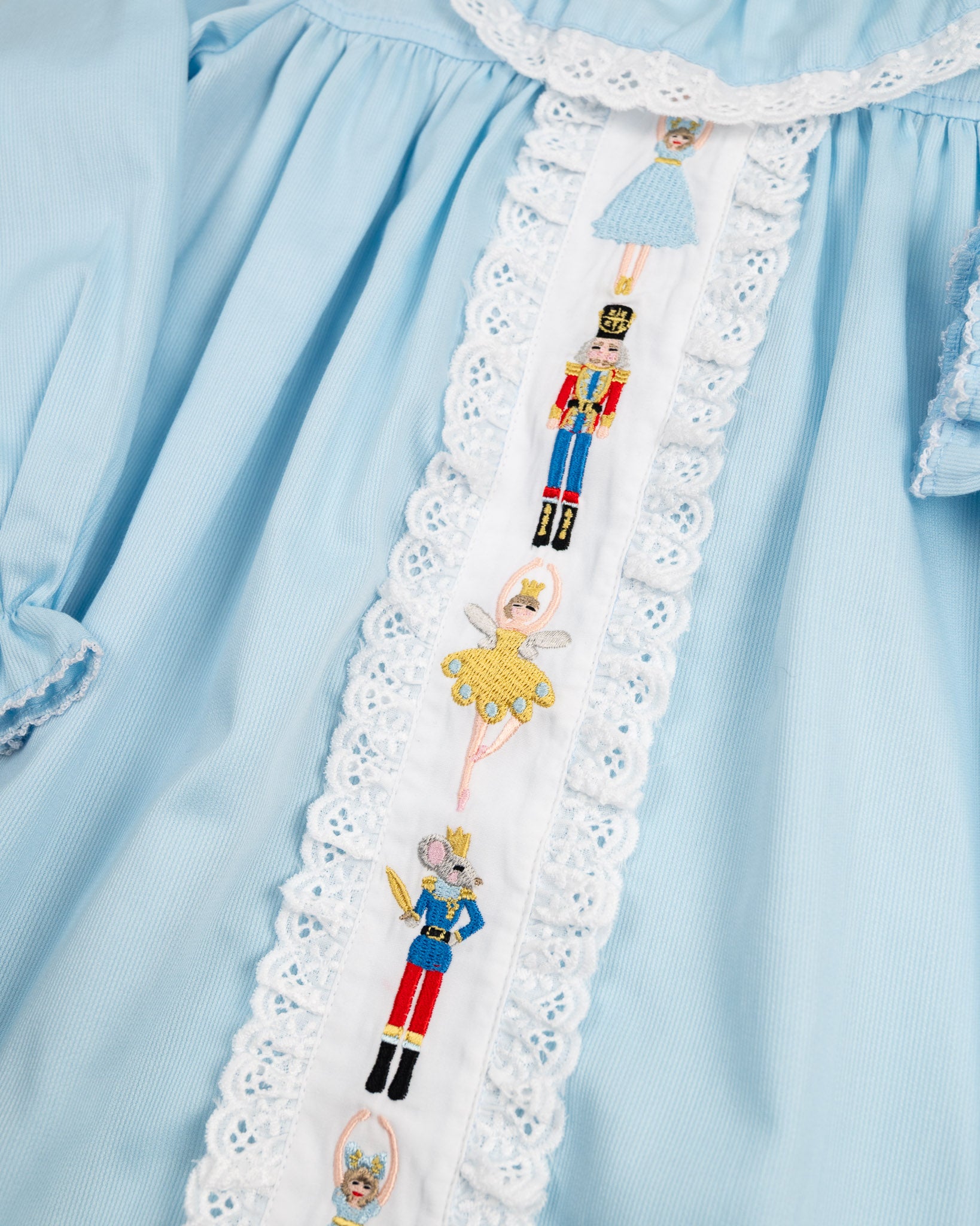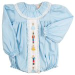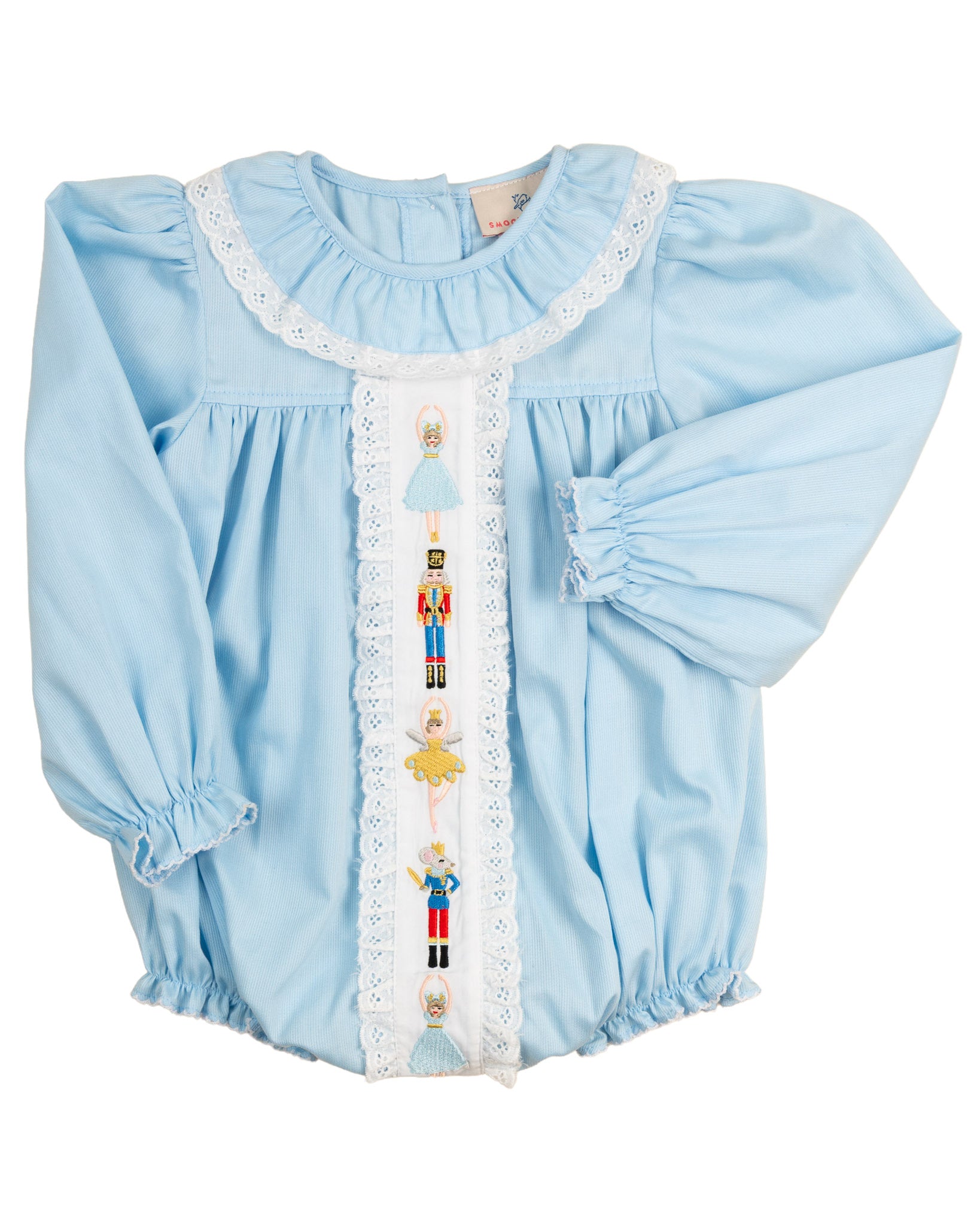 Let your little one twirl into a winter wonderland with our Blue Nutcracker Ballet Bubble. This beautifully embroidered piece showcases beloved Nutcracker ballet motifs on a dreamy blue canvas. With soft ruffle accents and long sleeves for warmth, this bubble outfit is as comfortable as it is stunning. Ideal for holiday festivities, first Christmas photos, and magical moments to cherish!