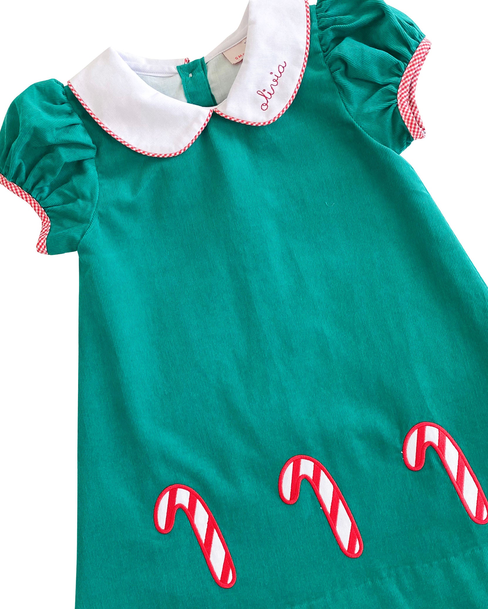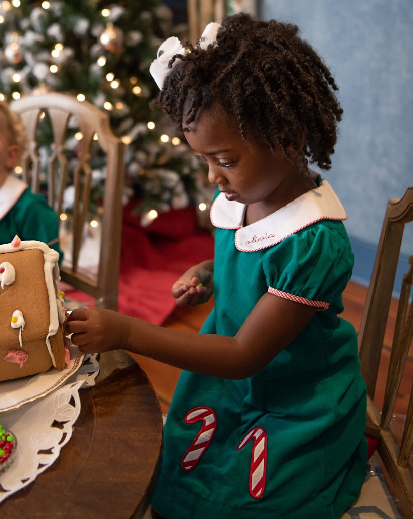 There is nothing sweeter than building a gingerbread house with your friends in our Candy Cane Applique Corduroy Dress. A-line with short puff sleeves and rounded Peter pan collar. We couldn't forget embroidered candy canes at the bottom. Dress comes fully lined. Add a name or monogram for a personal touch.