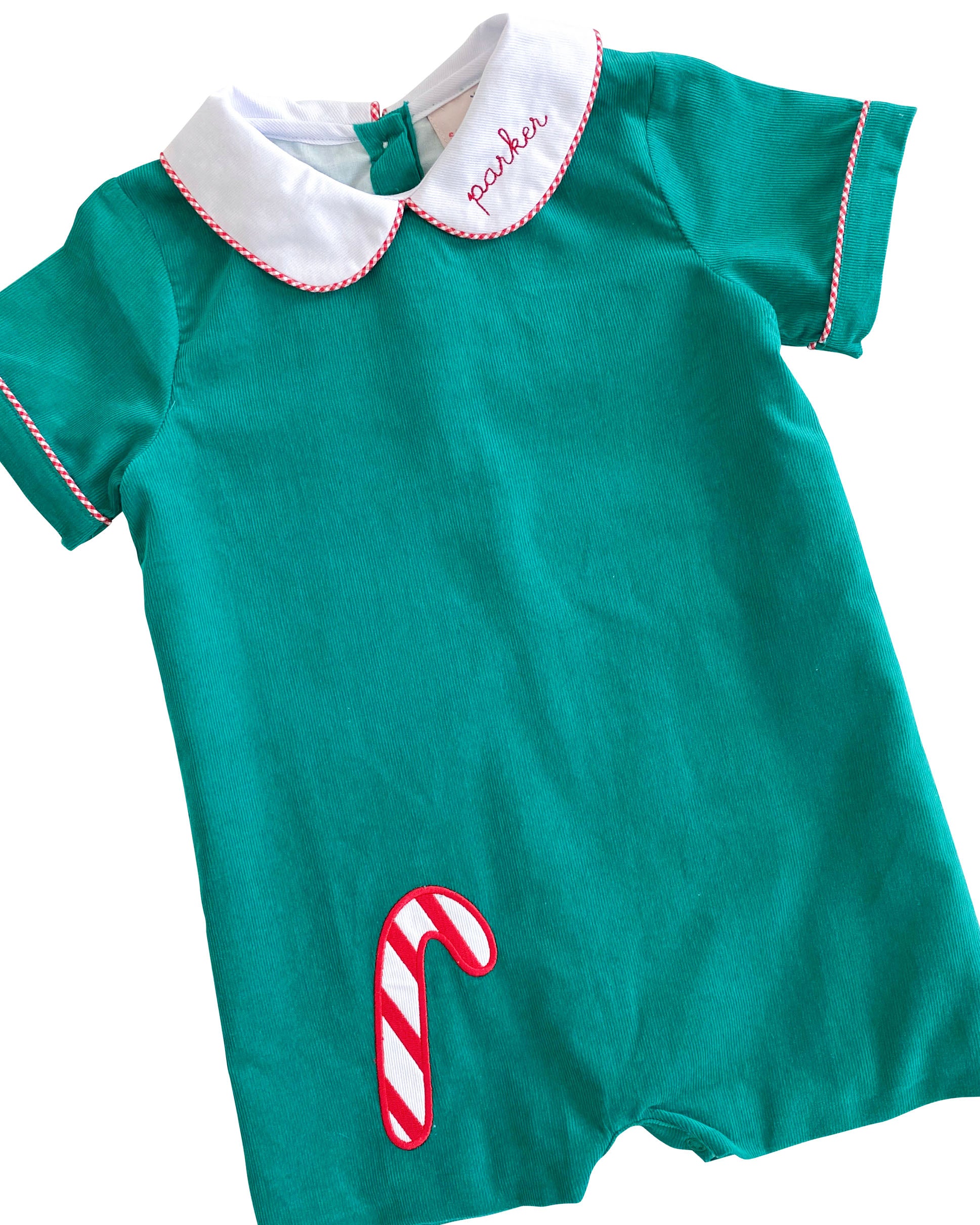 Stroll down candy cane lane in the sweetest candy can applique corduroy shortall. Rounded peter pan collard and metal snaps in stride—the perfect holiday outfit for school or family time. Add a name or monogram for a personal touch.