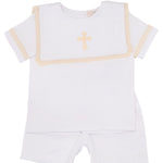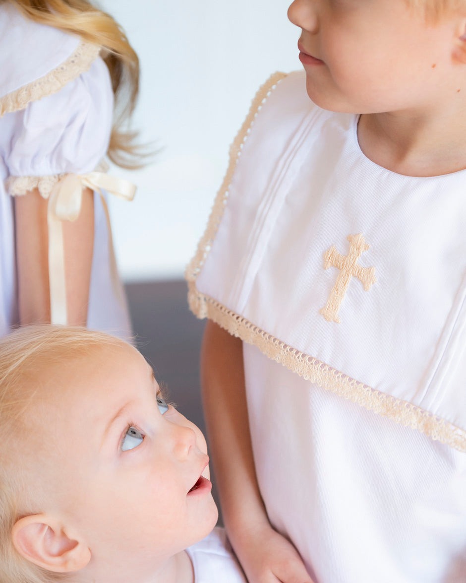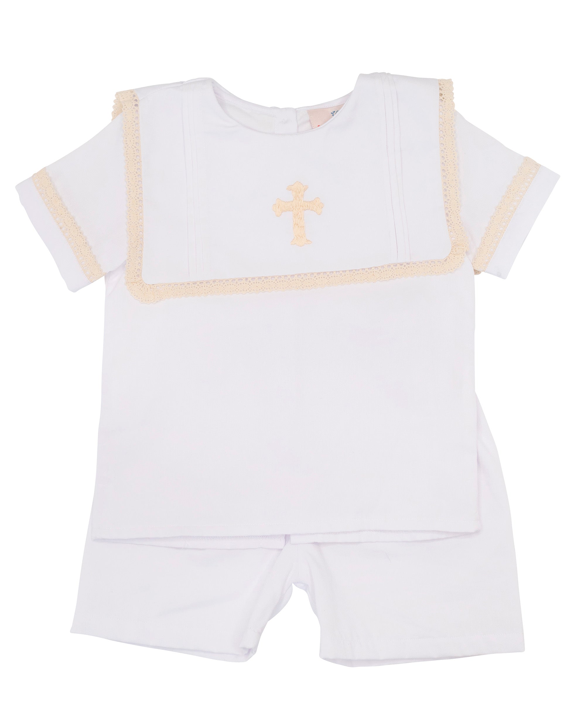 A white cotton short set with hand embroidered cream crosses on the bib collar makes this vintage style the perfect outfit for a Christening, Baptism or any Easter celebration. Fully lined with elastic waist in back or a perfect fit.
