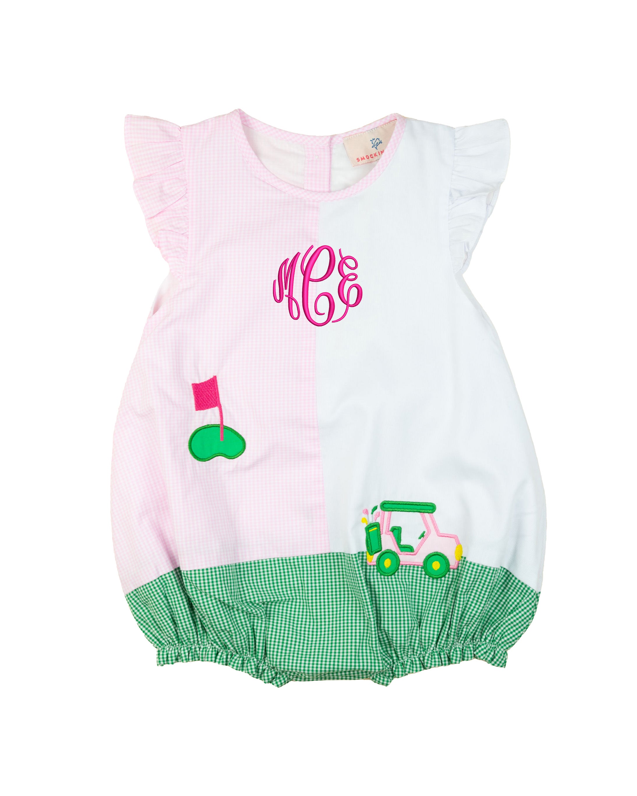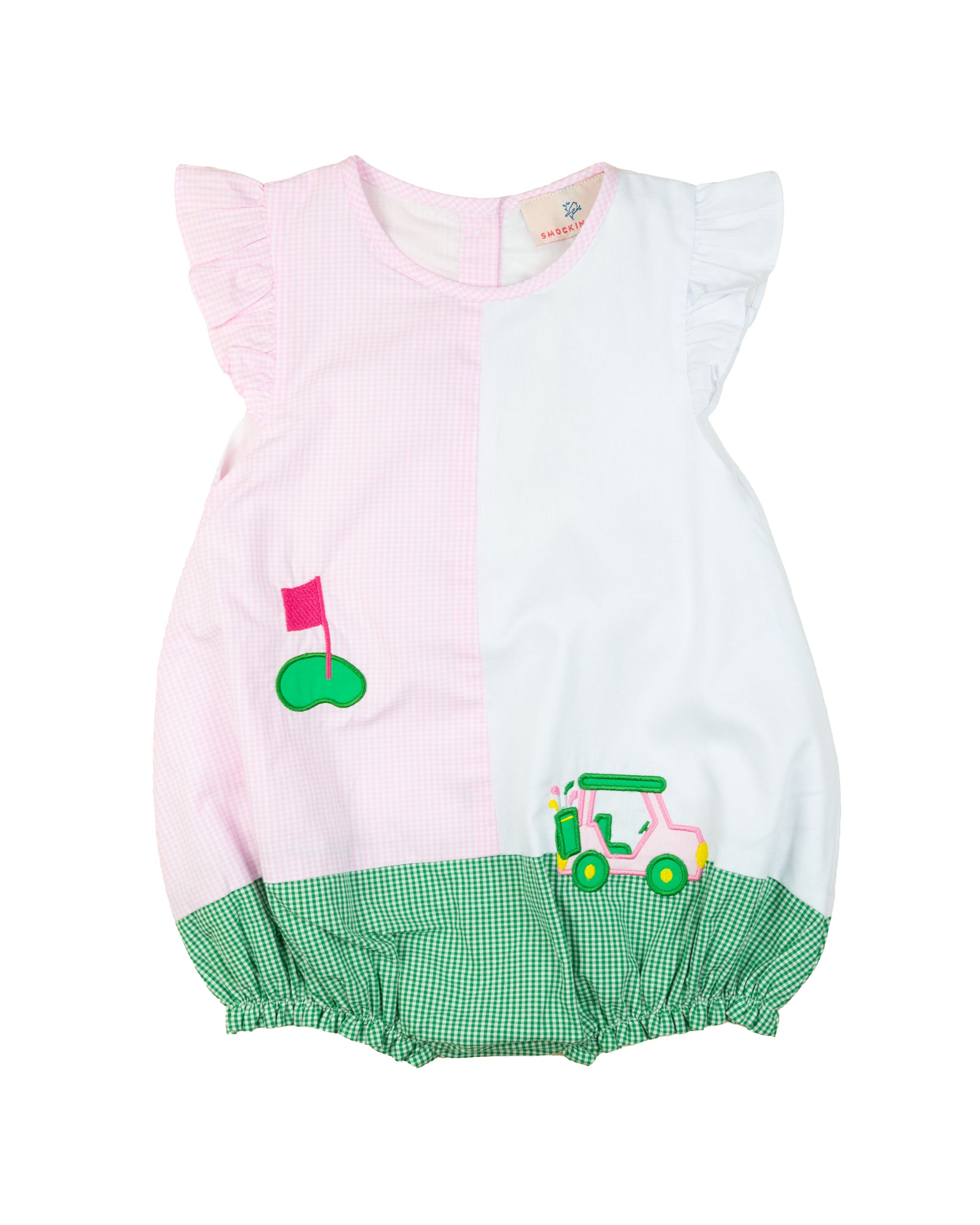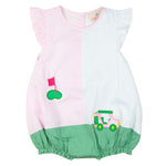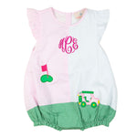 Swing into style this spring and summer with our Golf Cart Applique Ruffle Sleeve Bubble! Featuring an adorable golf cart design and playful ruffle sleeves, this bubble is perfect for your little one's warm-weather adventures. Comfortable, cute, and ideal for picture-perfect moments on or off the green!