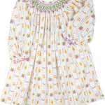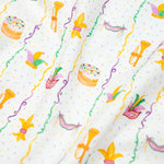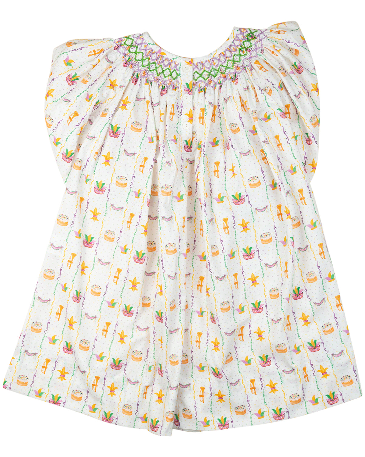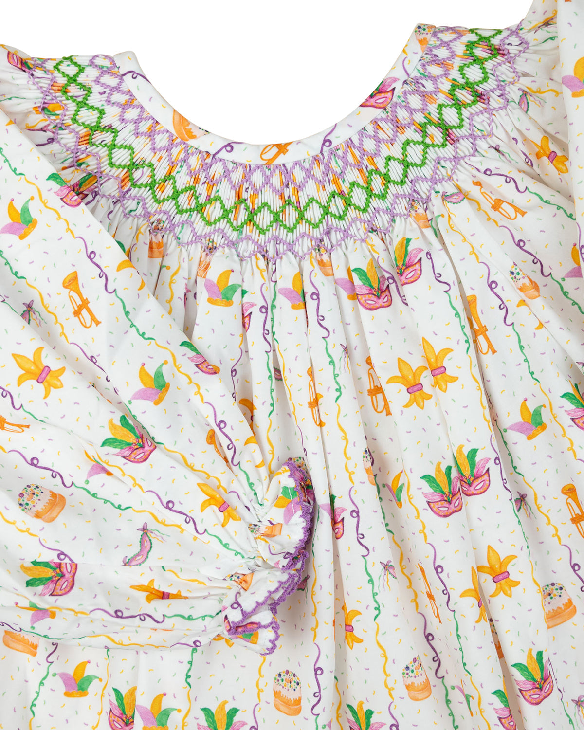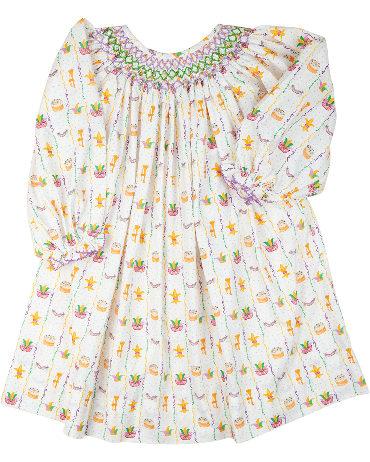 Let the good times roll with our festive Mardi Gras Smocked Dress! Featuring a playful Mardi Gras-inspired print with crowns, masks, and beads, this dress is perfect for celebrating in style. Designed with a classic smocked neckline, long sleeves, and a twirl-worthy silhouette, it ensures comfort and charm for your little one during any festive occasion.