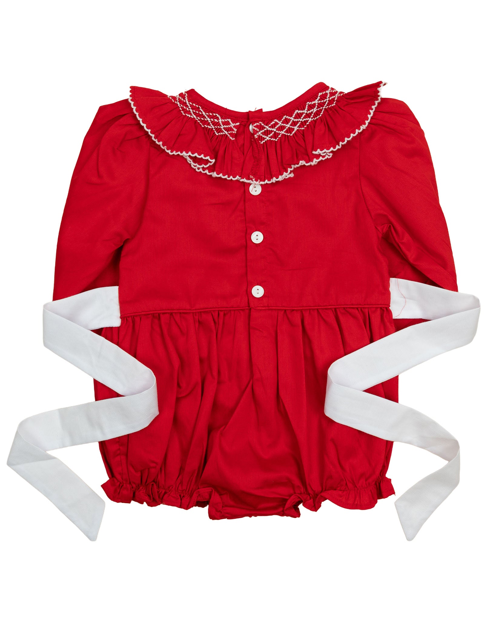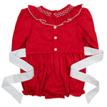 Sweet and sophisticated, our Red Smocking Bubble is a must-have for the season! This heirloom-inspired piece showcases exquisite smocked details, long sleeves, and a charming white sash that ties into a bow for a picture-perfect look. Designed with comfort and style in mind, this bubble is perfect for festive occasions and special memories.