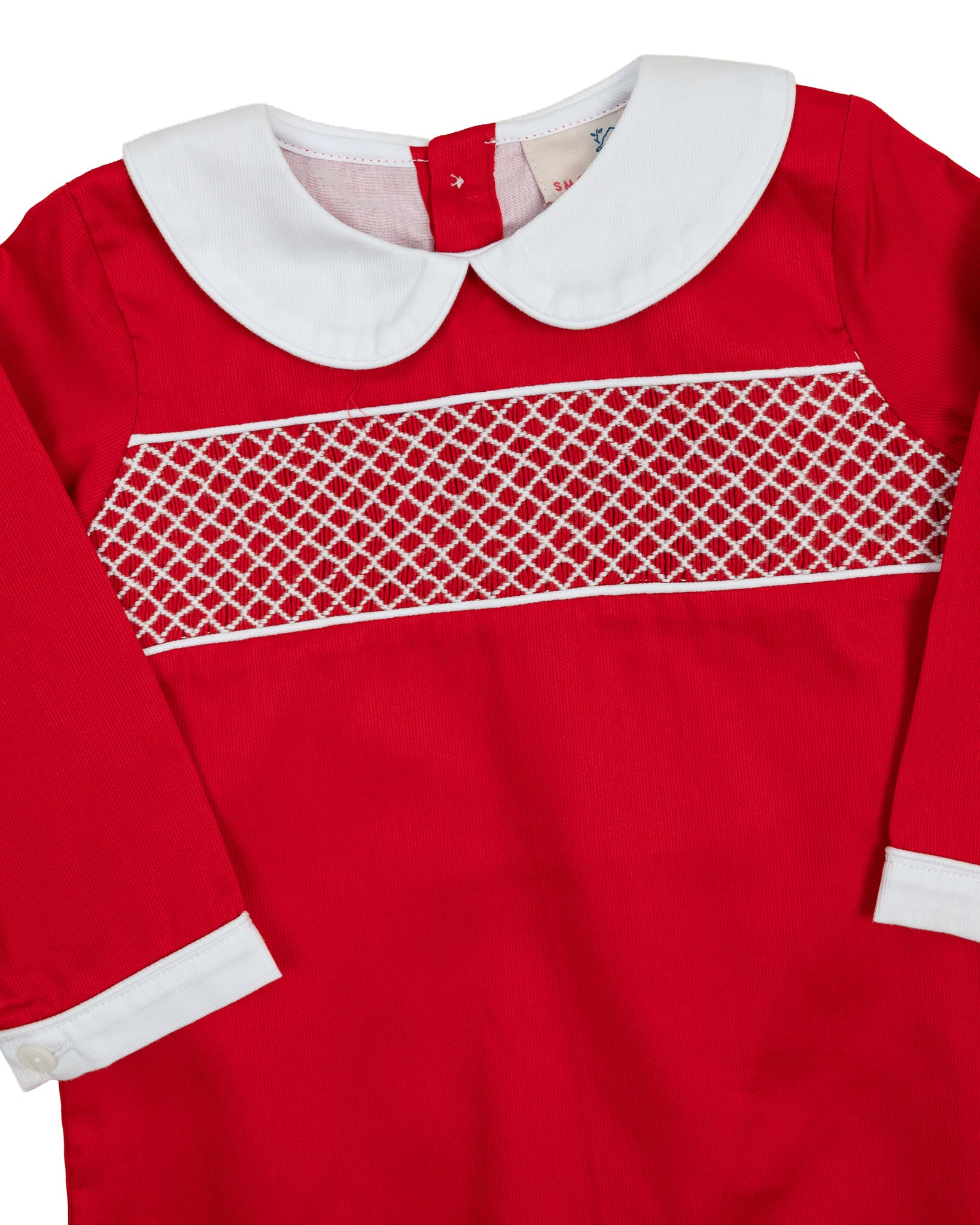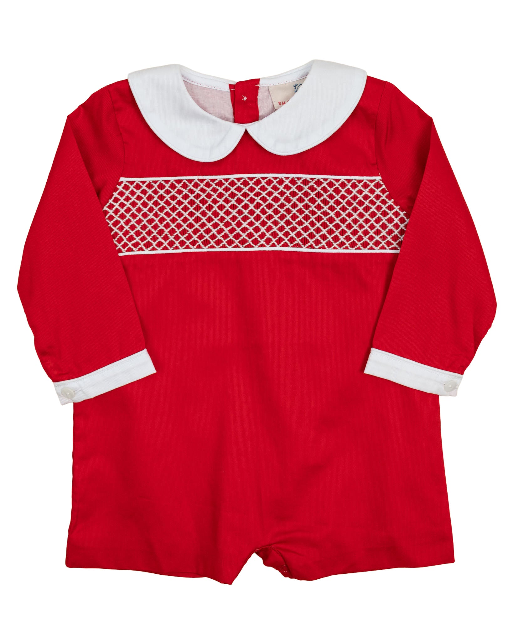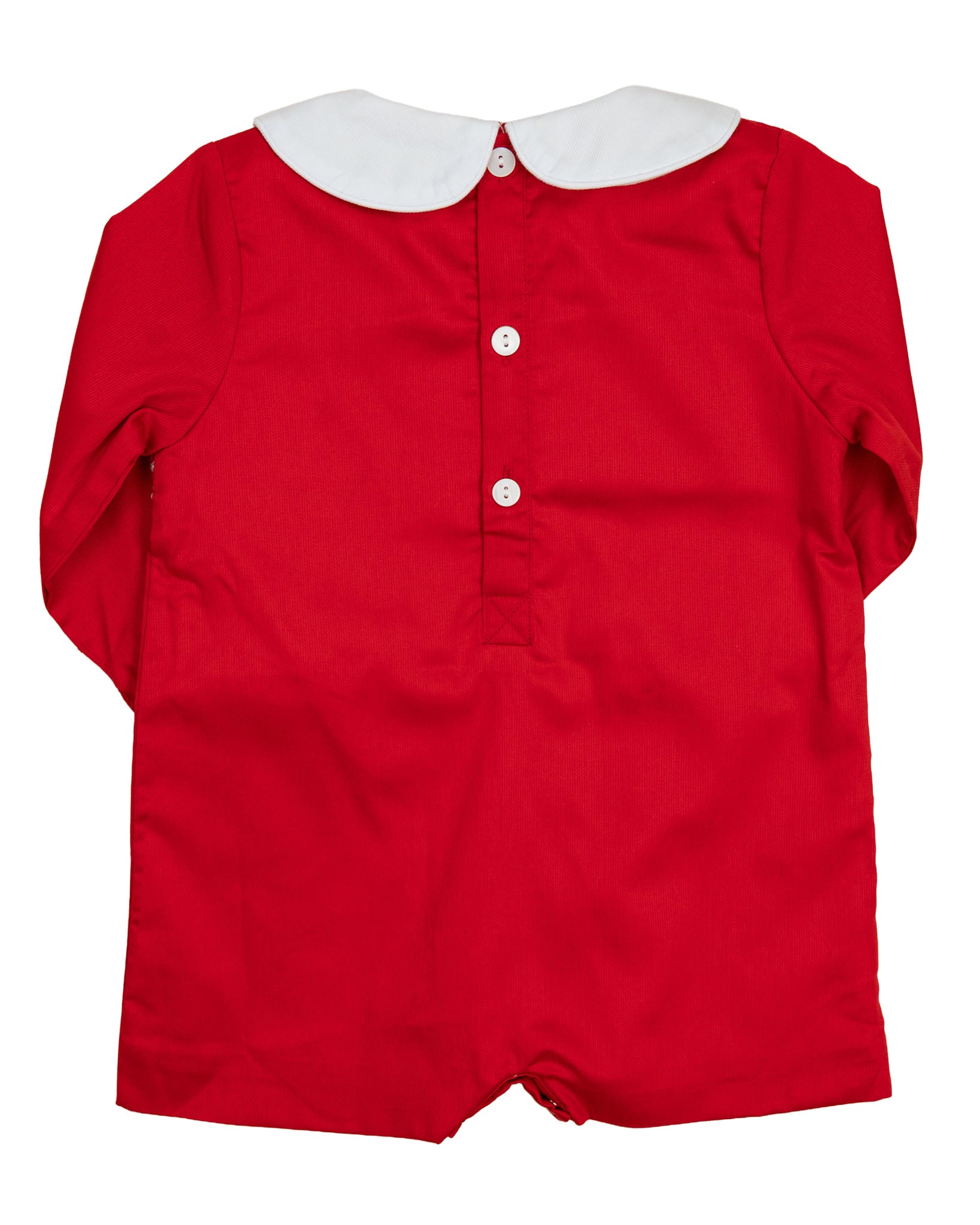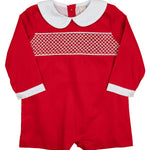 Dress up your little one in classic holiday style with our Red Smocked Shortall. Featuring a crisp white collar, intricate smocked detailing, and long sleeves, this outfit blends tradition with comfort. Perfect for holiday gatherings, winter celebrations, and family photos, this longall is a timeless staple for the season.