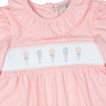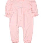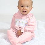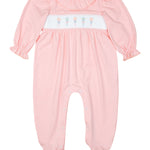 This precious soft cotton smocked one piece layette is perfect for baby girls! With smocked baby rattles across chest, a ruffled collar and snaps in stride, it is the perfect outfit for your baby girl.