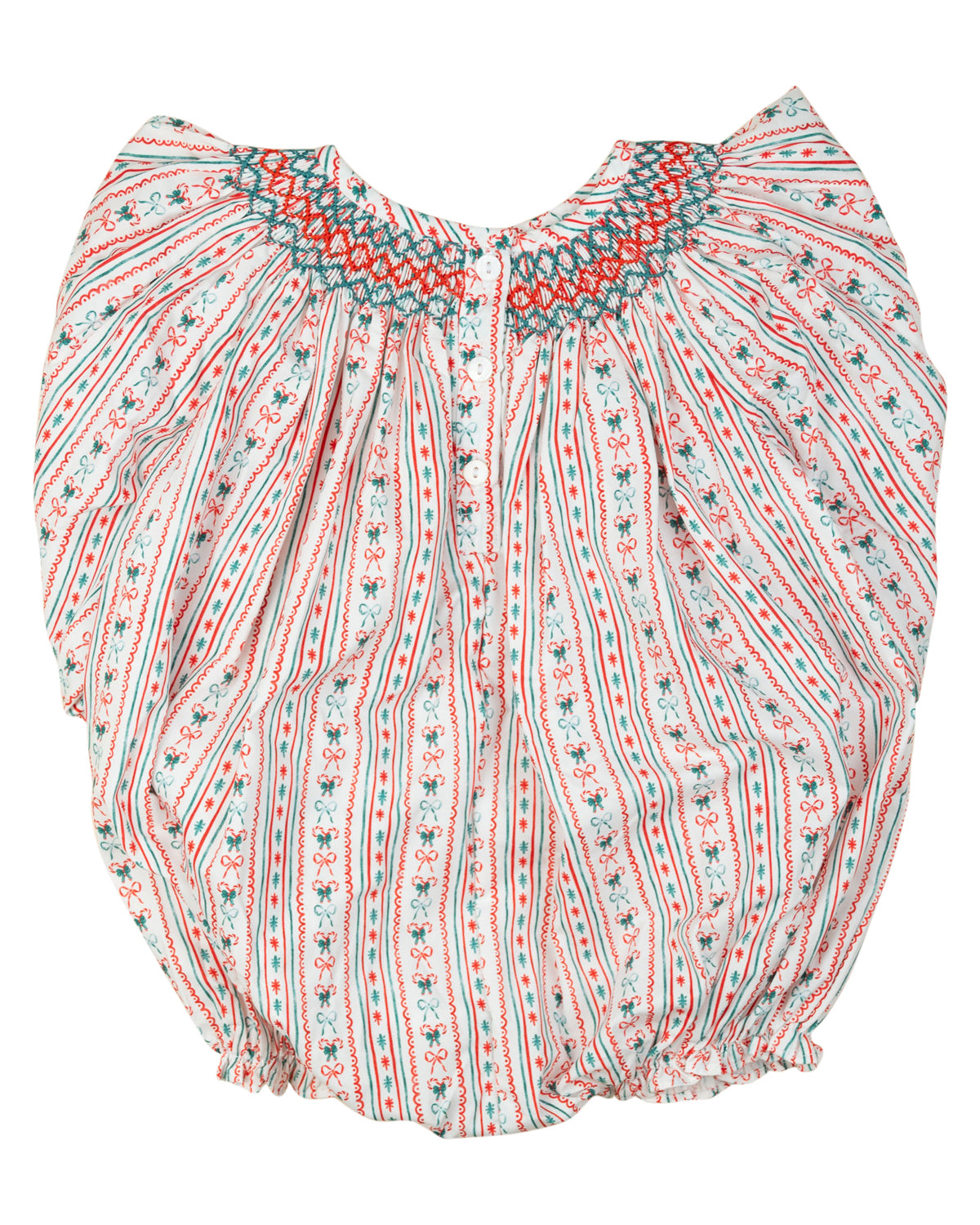 Dress your little one in pure holiday magic with our Candy Cane Bubble! Featuring intricate hand-smocked details, soft ruffled trim, and a delightful candy cane print, this one-piece is both festive and comfortable. Designed for easy wear with a back button closure and bottom snaps, it’s the perfect outfit for holiday parties, pictures, and cozy winter days.